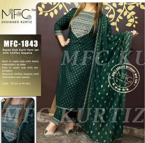 Rayon Printed Kurta With Embroidered Pant & Cotton Dupatta Kurta Fabric: Rayon Bottomwear Fabric: Rayon Fabric: Mulmul Sleeve Length: Three-Quarter Sleeves Set Type: Kurta With Dupatta And Bottomwear Bottom Type: Pants Pattern: Printed Multipack: Single Sizes: XL (Bust Size: 42 in, Shoulder Size: 14.5 in, Kurta Waist Size: 40 in, Kurta Hip Size: 44 in, Kurta Length Size: 46 in, Bottom Waist Size: 33 in, Bottom Hip Size: 44 in, Bottom Length Size: 38 in, Duppatta Length Size: 2.2 m) L (Bust Size: 40 in, Shoulder Size: 14 in, Kurta Waist Size: 38 in, Kurta Hip Size: 42 in, Kurta Length Size: 46 in, Bottom Waist Size: 31 in, Bottom Hip Size: 42 in, Bottom Length Size: 38 in, Duppatta Length Size: 2.2 m) M (Bust Size: 38 in, Shoulder Size: 13.5 in, Kurta Waist Size: 36 in, Kurta Hip Size: 40 in, Kurta Length Size: 46 in, Bottom Waist Size: 29 in, Bottom Hip Size: 40 in, Bottom Length Size: 38 in, Duppatta Length Size: 2.2 m) XXL (Bust Size: 44 in, Shoulder Size: 15 in, Kurta Waist Size: 42 in, Kurta Hip Size: 46 in, Kurta Length Size: 46 in, Bottom Waist Size: 35 in, Bottom Hip Size: 46 in, Bottom Length Size: 38 in, Duppatta Length Size: 2.2 m) XXXL (Bust Size: 46 in, Shoulder Size: 15.5 in, Kurta Waist Size: 44 in, Kurta Hip Size: 48 in, Kurta Length Size: 46 in, Bottom Waist Size: 36 in, Bottom Hip Size: 48 in, Bottom Length Size: 38 in, Duppatta Length Size: 2.2 m) Rayon Printed Kurta With Embroidered Pant & Cotton Dupatta Country of Origin: India