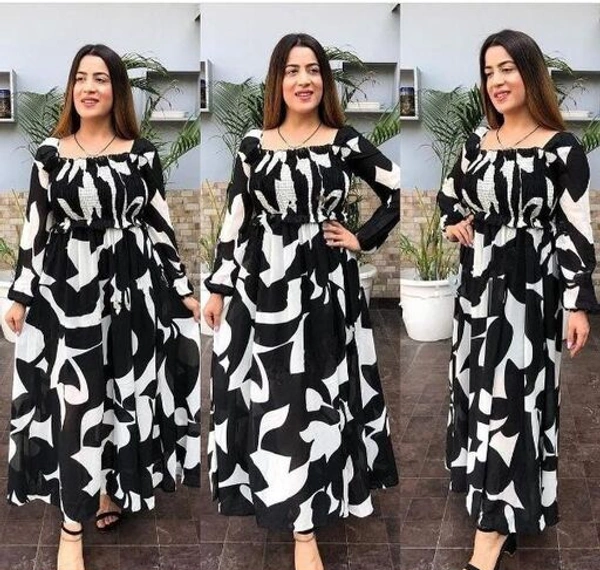 Beautiful Calf Multicolour Calf Length Dress For Women. This Dress Is Made Up With Soft And Smooth Georgetta Fabric .This Dress Is Off Solder And Chest Smocked, Placed Very Good Quality Lining Inside ,Its Makes Non Transparent Dress, Wear This Dress In Party Or Regular Wear